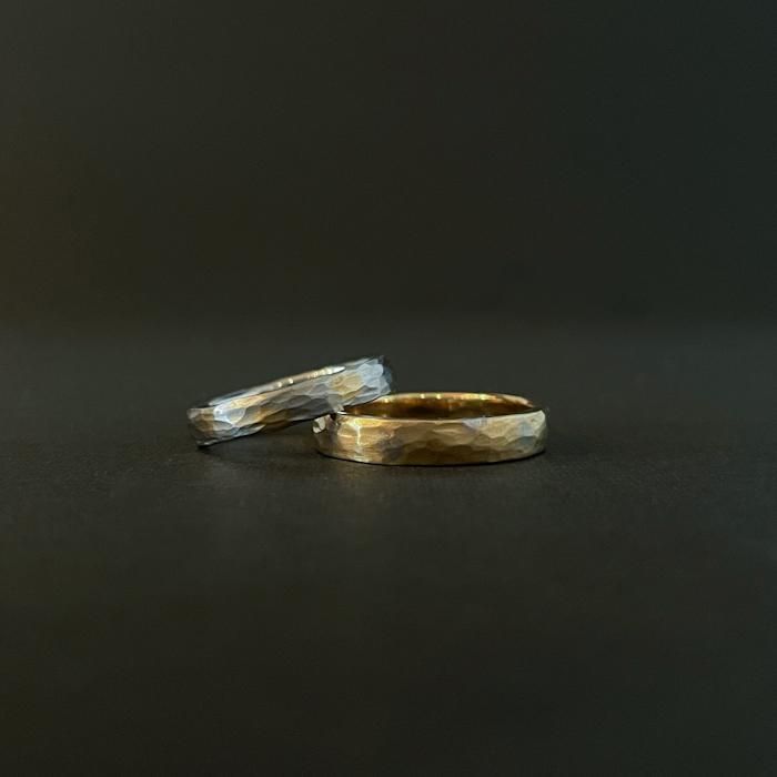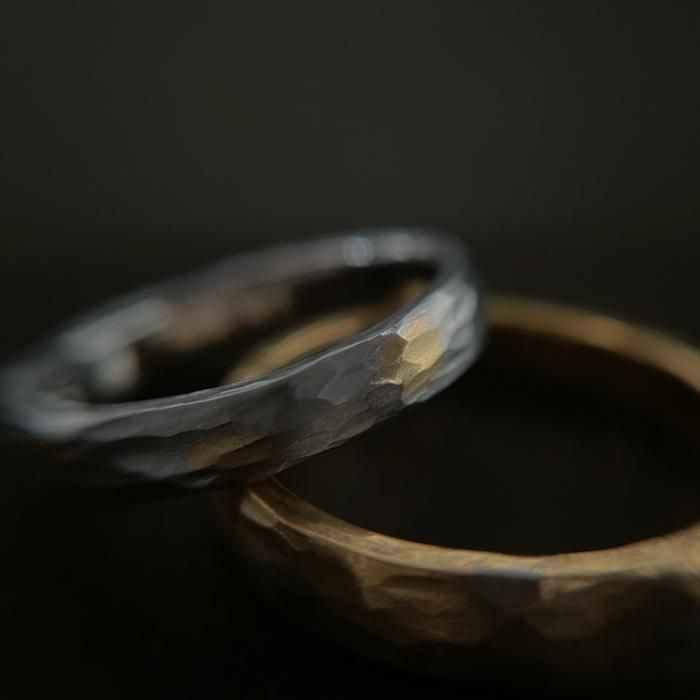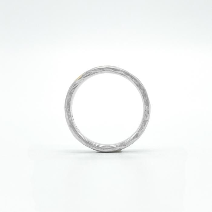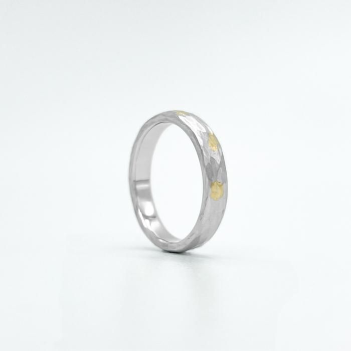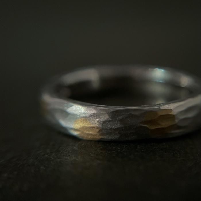 ご注文を受けて一つひとつ鍛造製法でおつくりするプラチナリングの表面に、イエローゴールドを散りばめ埋め込み、最終的に打ち込んで完成する一点物の"まだら"リング。