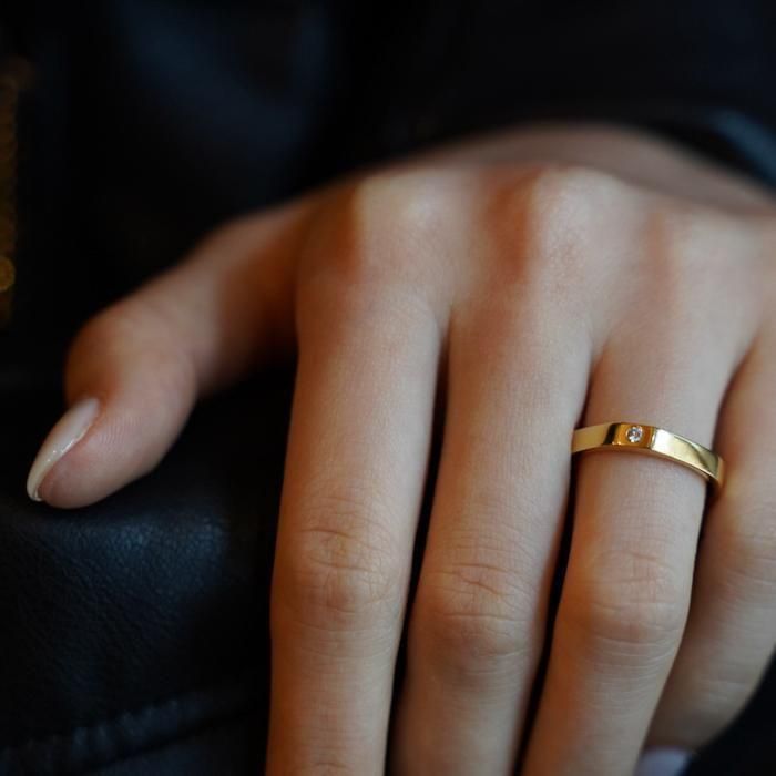 指もとで輝くダイヤモンドのポジションを自由に変えることができるので、見られる角度によって様々な印象を残す遊び心をもったゴールドリングです。